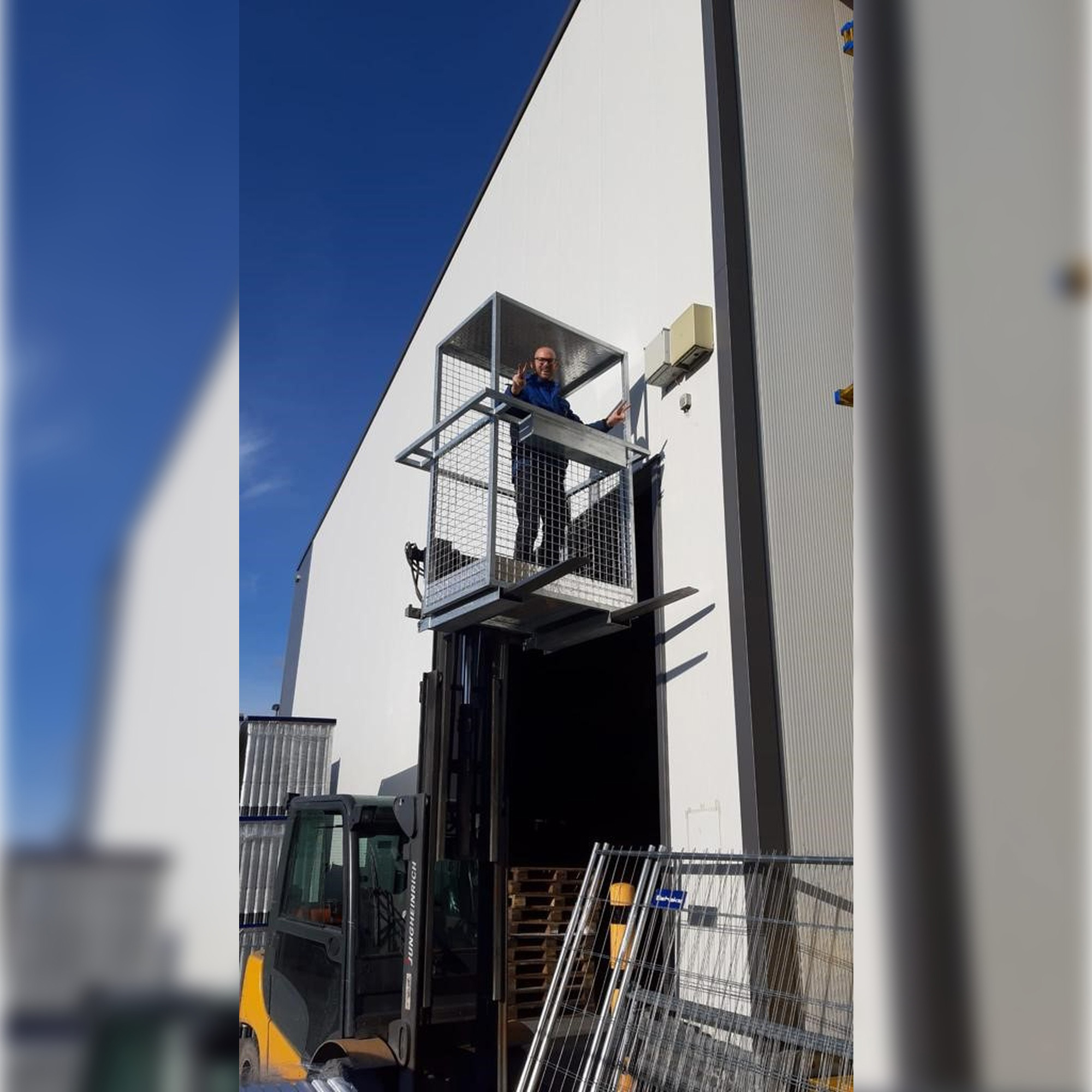 Cesta metálica de trabajo porta operarios con elevación mediante horquillas de carretillas elevadoras y otros vehículos montacargas.
