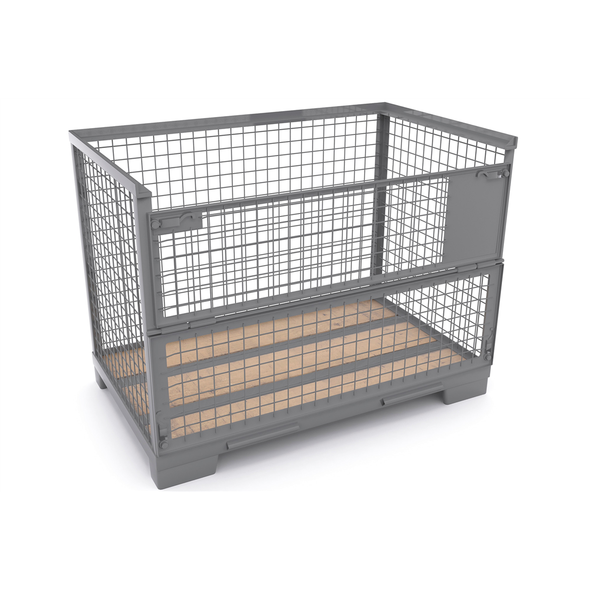 Jaula metálica con estructura de acero galvanizado y piso de madera, de uso universal para almacenar y transportar mercancías voluminosas. Base de palet europeo de dimensiones 1.200×800 mm y ventana plegable. Capacidad de carga 1,5 t