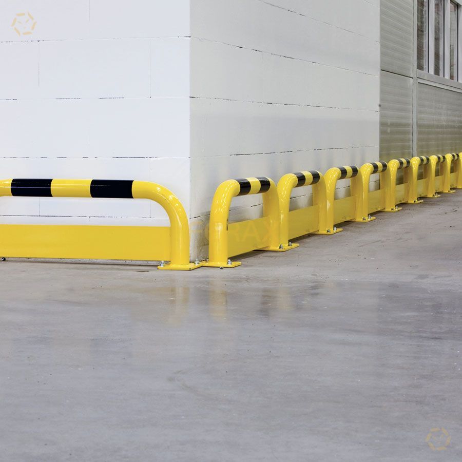 Barrera arco de protección con placa central antiempotramiento de 4 mm de espesor, que proporciona una protección efectiva contra horquillas de carretillas elevadoras, transpaletas manuales, transpaletas eléctricas y otros vehículos montacargas.