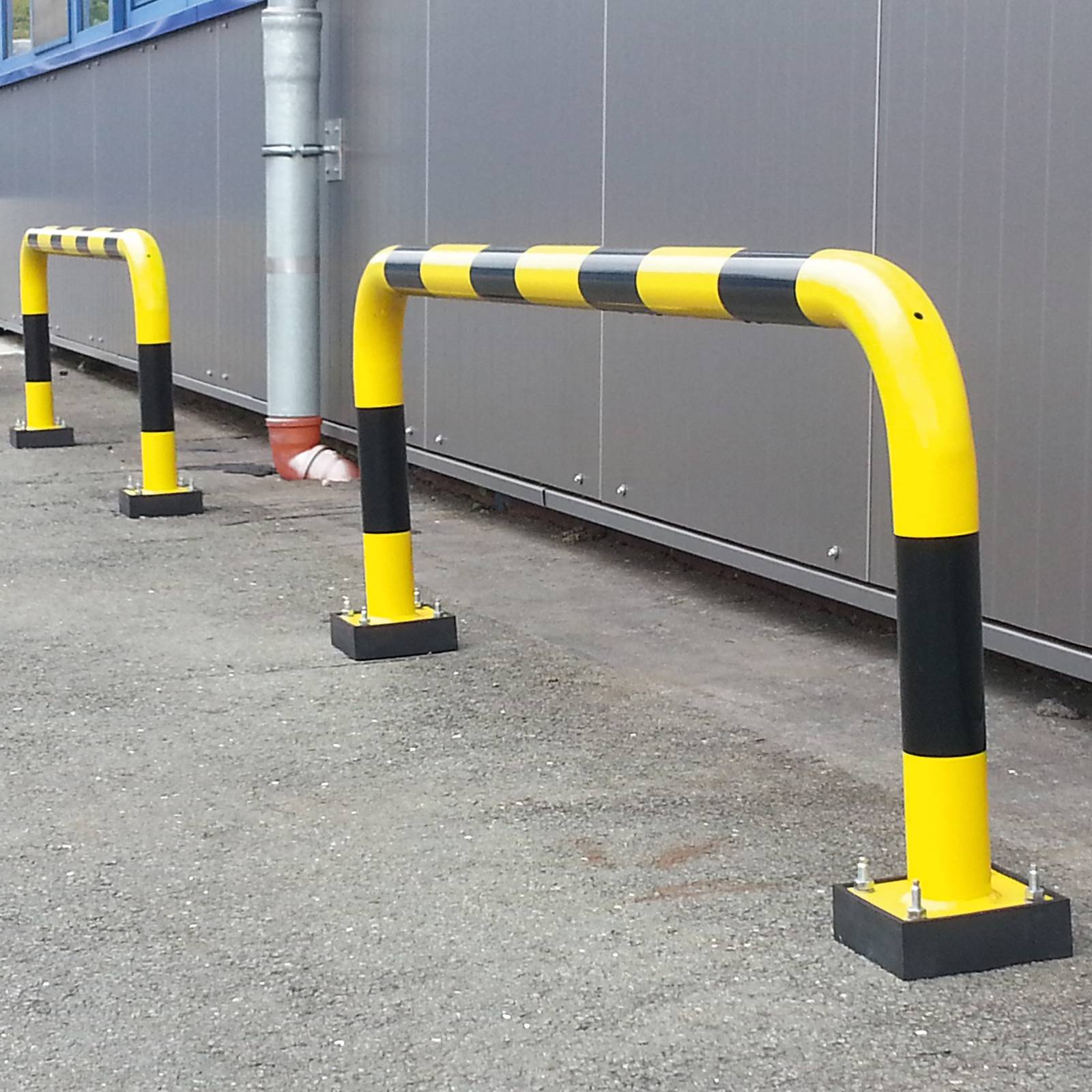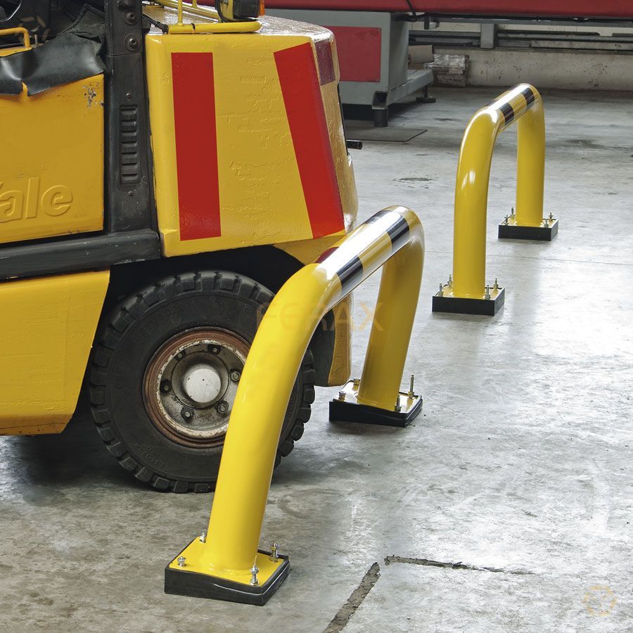 Barrera arco de protección flexible en acero lacado, y acero galvanizado lacado para exterior. Se suministra con bases de poliuretano flexible que permiten a la barrera inclinarse hasta 10º tras el impacto. De gran resistencia a choques y a la torsión.