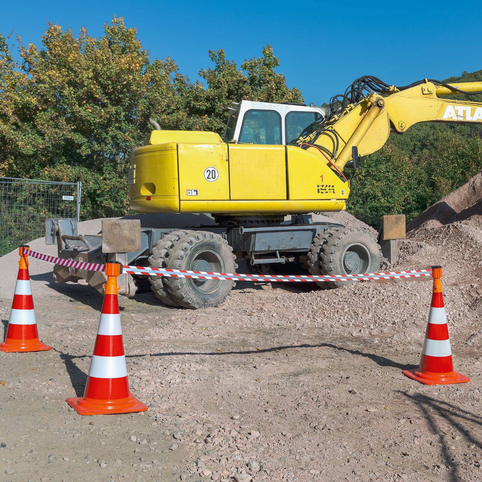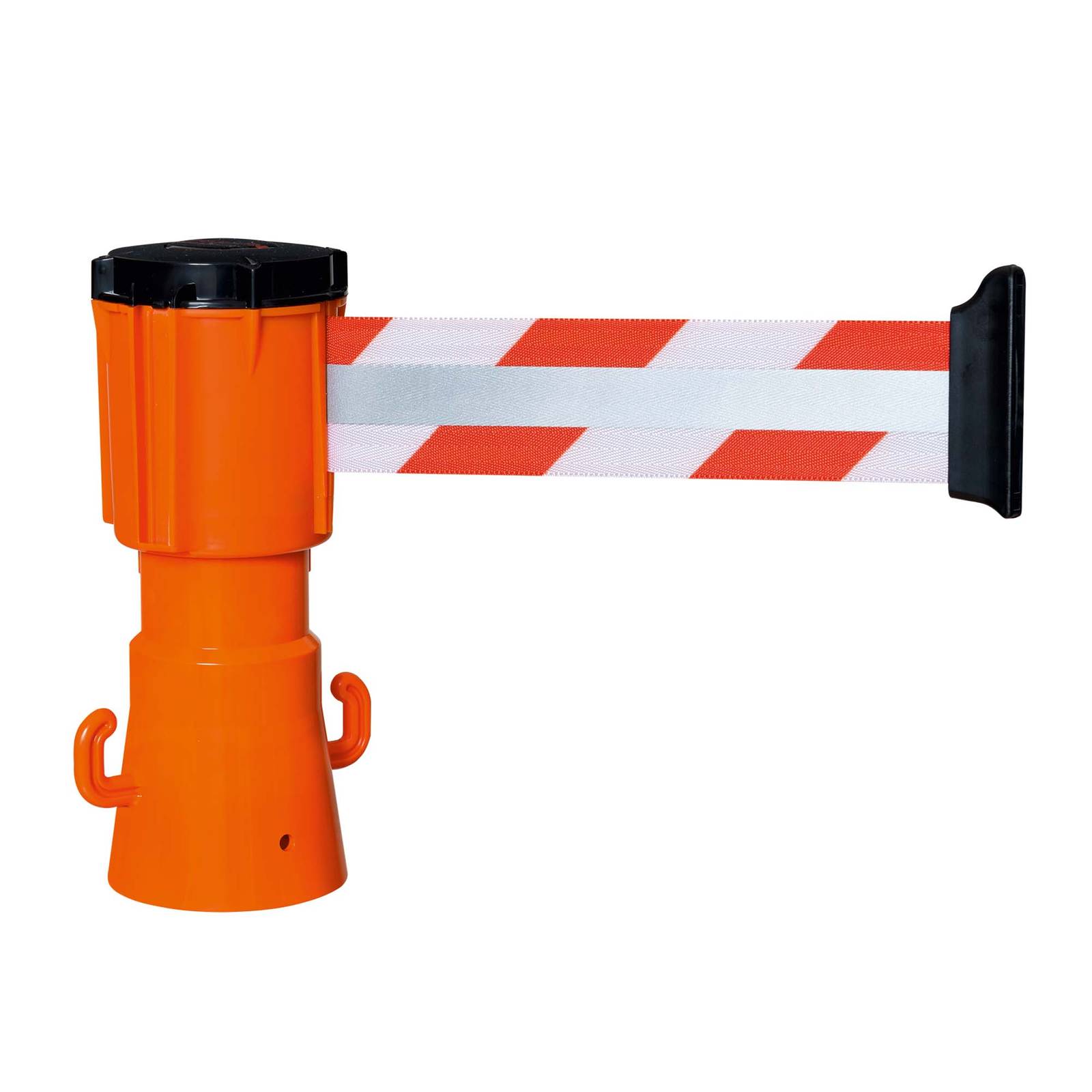 Carrete con cinta extensible rectráctil reflectante, de longitud 3 metros par acoplar sobre un cono de tráfico estándar. Incorpora ganchos adicionales para colgar objetos (cadenas, luces de advertencia, etc.)