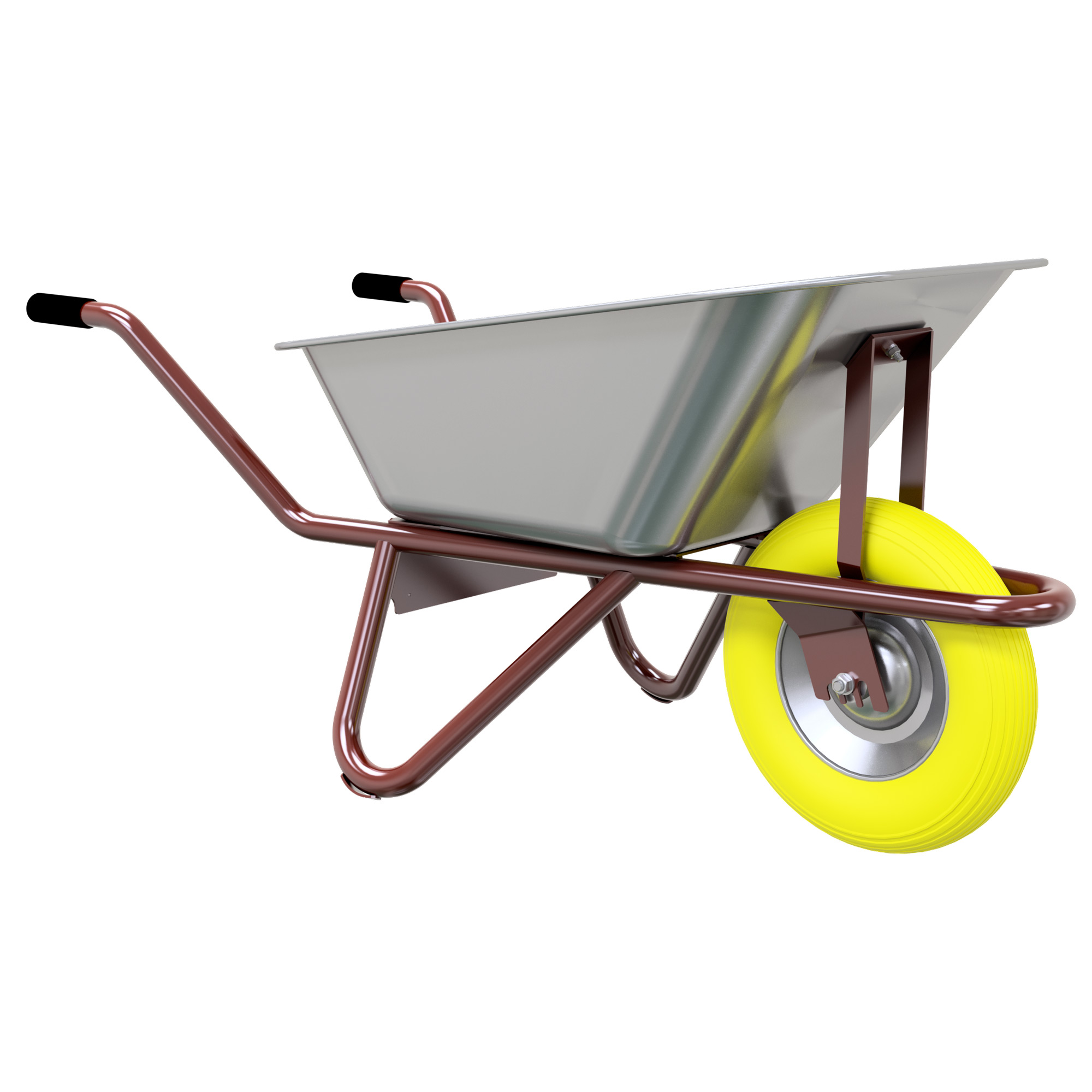 Carretilla de acero galvanizado con pieza de refuerzo en bandeja, para transporte de todo tipo de materiales en obras de construcción, albañilería, jardinería, etc. Bandeja galvanizada de 1,25 mm de grosor y 90 l de capacidad.