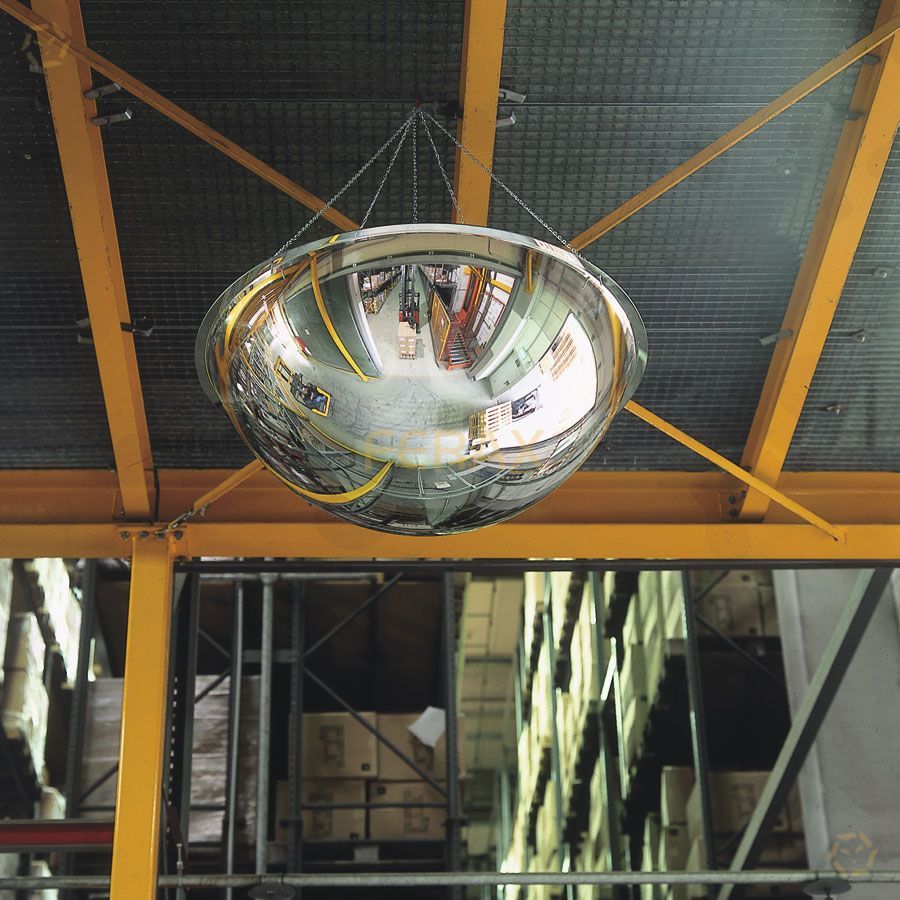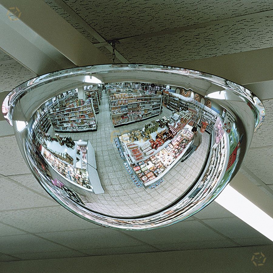Espejo de vigilancia domo 360 de media esfera panorámico con superficie en cristal acrílico, para uso en espacios interiores con techos normales, altos o de gran altura.