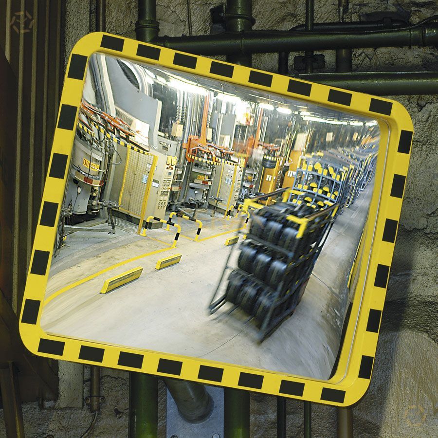 Espejo convexo industrial fabricado en cristal acrílico de diseño rectangular o circular, y excelente calidad óptica. La superficie altamente curvada, proporciona un amplio campo de visión (efecto gran angular) y una excelente reproducción de las imágenes.