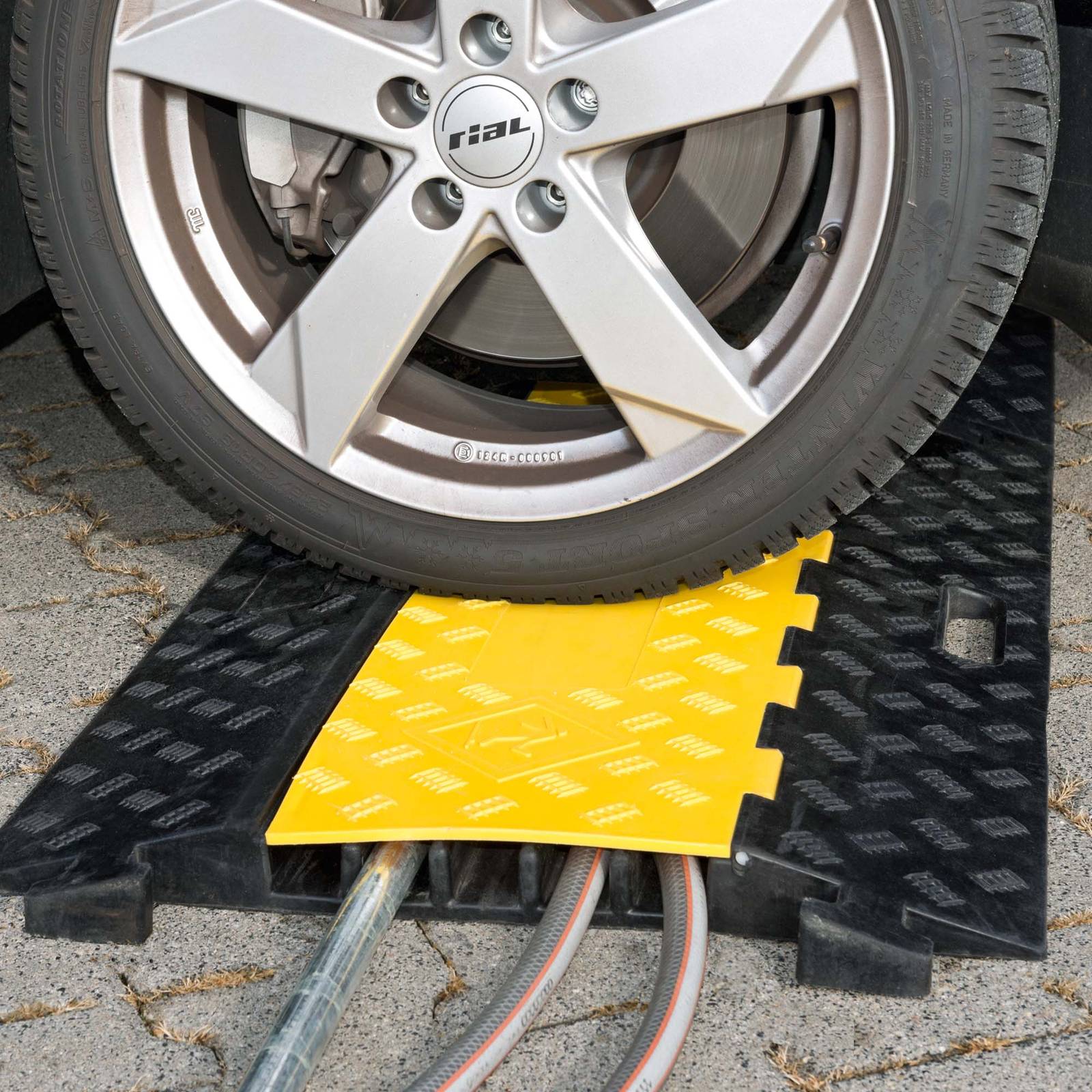 Rampa pasacables para suelo con 5 canaletas, que salva y protege cables, tubos, mangueras y otros conductos, resguardándolos de las rodaduras de vehículos, pesados inclusive. Las rampas encajan unas con otras formando una línea contínua y pueden fijarse al suelo con anclajes.